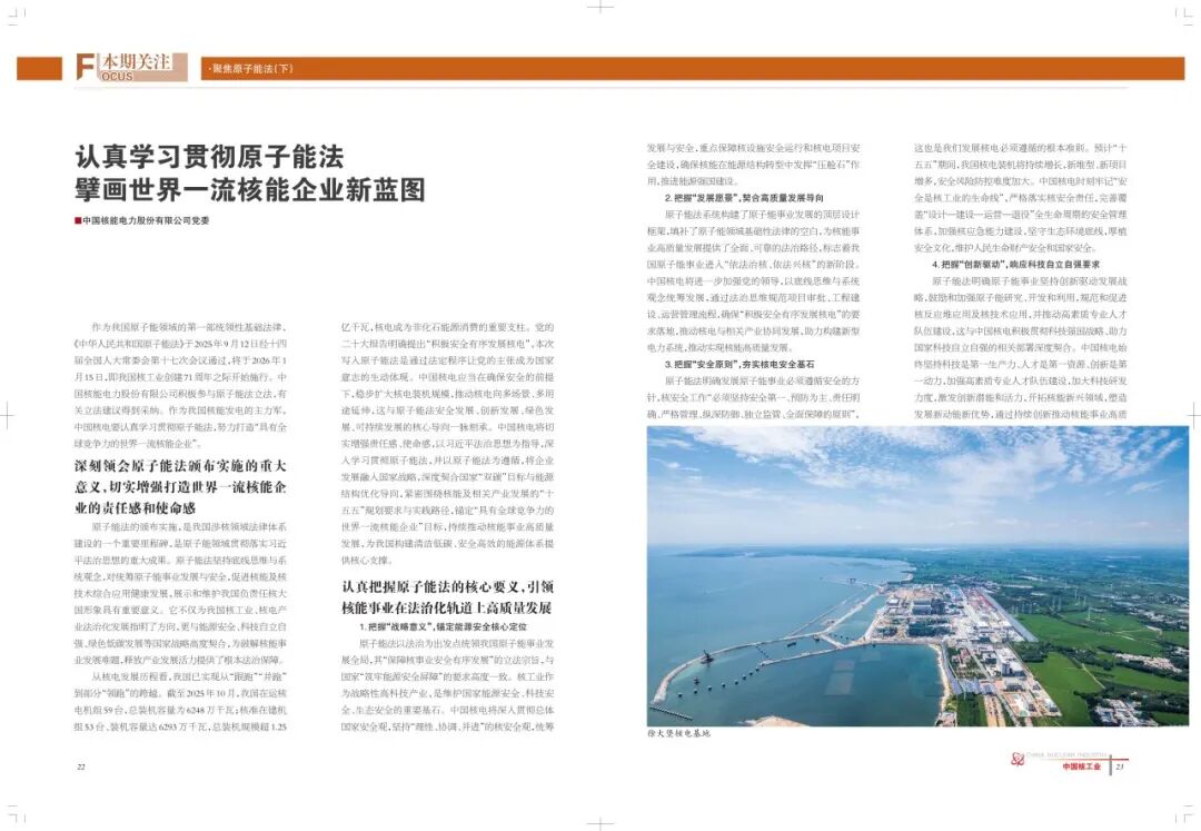 法立于行,核安于心。原子能法不仅是法律文本,更是行动指南、责任载体。中国核电将以原子能法实施为契机,持续推动依法治企、合规经营,将法律要求转化为企业治理效能和发展动力,在法治轨道上奋力谱写核能高质量发展新篇章,为保障国家能源安全、推动“双碳”目标实现作出更大贡献。